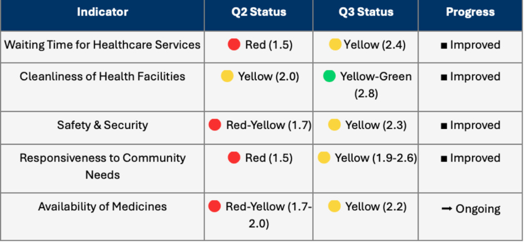 Key Takeaway: The transition from Red ➡ Yellow ➡ Green demonstrates tangible improvements in service delivery. These changes reflect how community-driven accountability and regular follow-up dialogues foster real impact in health systems performance.